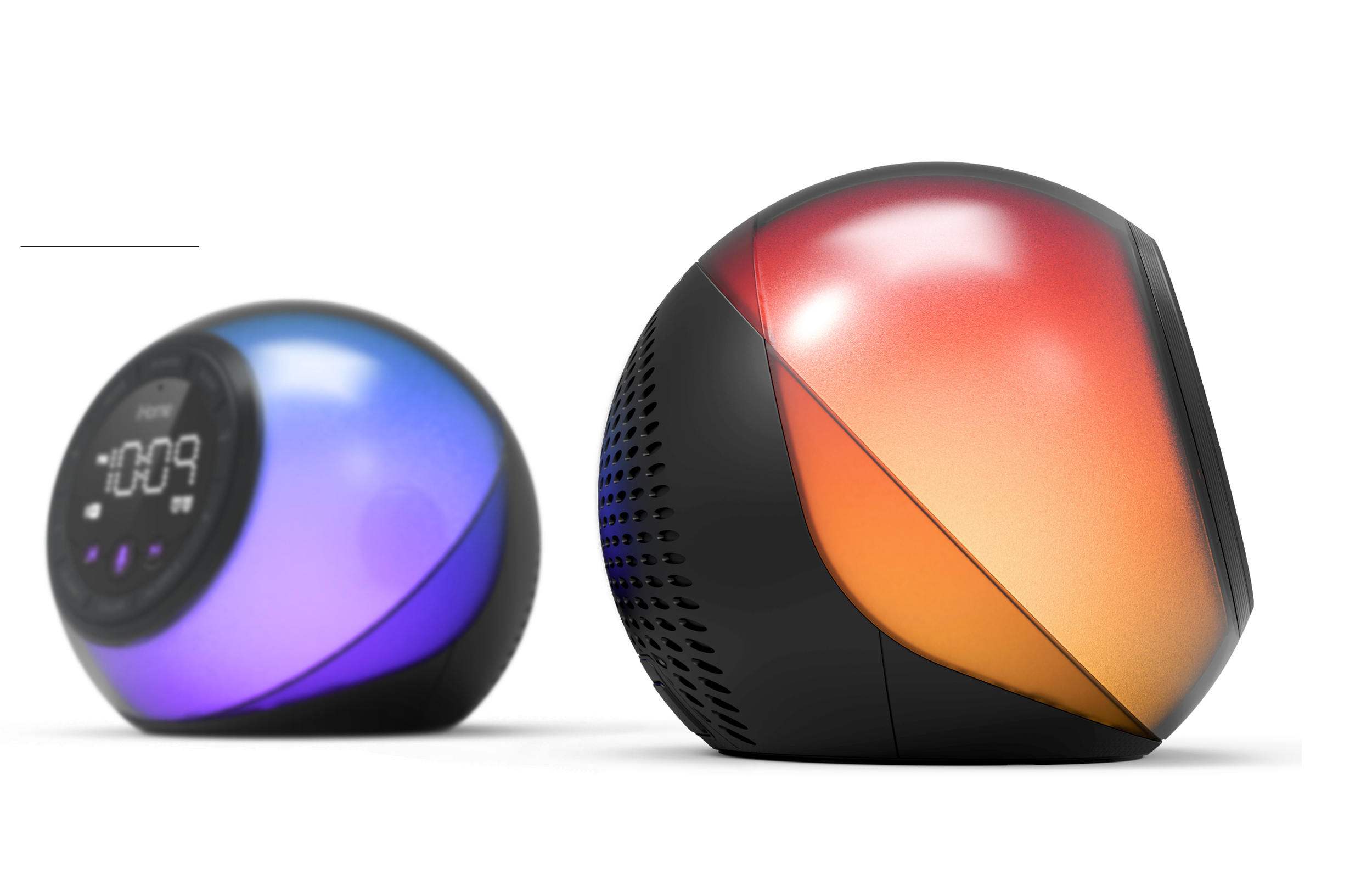 Innovative design of the iBT297 app-enhanced alarm clock with voice control and customizable smart button.